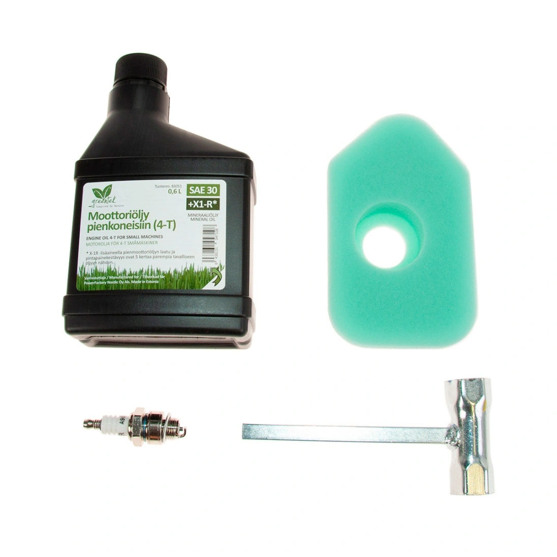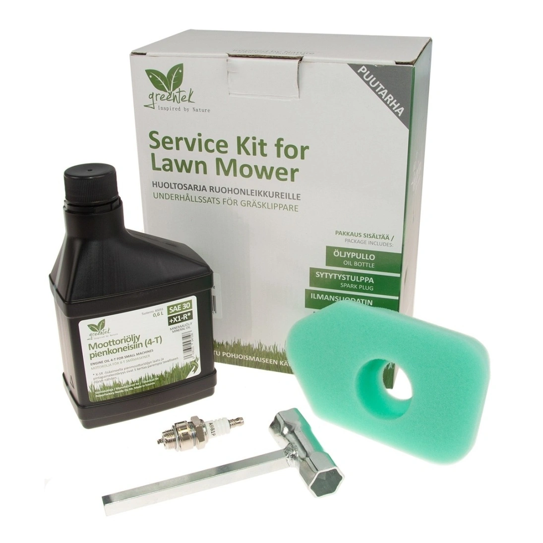 Greentek huoltopaketit sisältävät kaiken oleellisen leikkurin perushuoltoon. Kaikki näppärästi yhdessä paketissa.